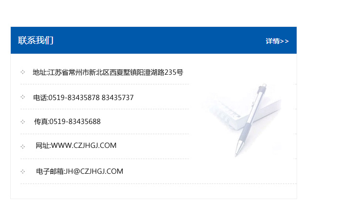 地址:常州市新北區(qū)友邦商務(wù)大廈1幢16、17層  電話:0519-85101652  傳真:0519-85112595  郵編:213022  網(wǎng)址:www_cz-jiayue_cn.pccui.com  郵箱:xiajifengaa@163.com